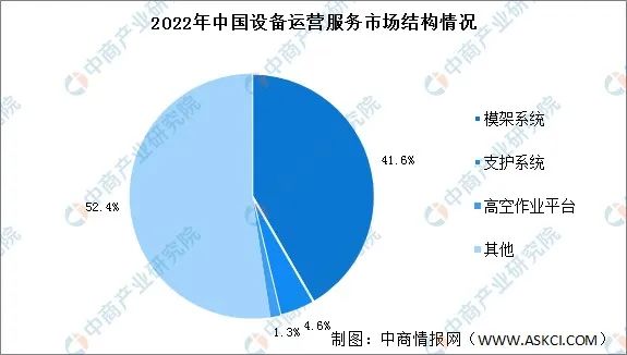 从细分市场来看,我国设备运营服务主要为模架系统运营服务。模架系统运营服务占比41.6%。支护系统运营服务、高空作业平台运营服务占比较小,分别为4.6%、1.3%。
